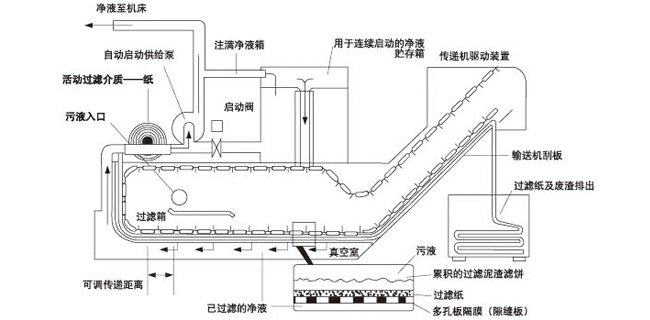 含有雜質的冷卻液進入臟液箱后,過濾泵開始工作,在負壓室內形成的負壓,使臟冷卻液透過過濾布進入負壓室,形成凈液,保存在儲液箱中,再由工作泵泵向主機。此過程中雜質被吸附在濾布上。當濾布堵塞嚴重時,由發(fā)訊系統(tǒng)發(fā)出指令,驅動減速機自動更新濾布,機器進去下一階段循環(huán)。